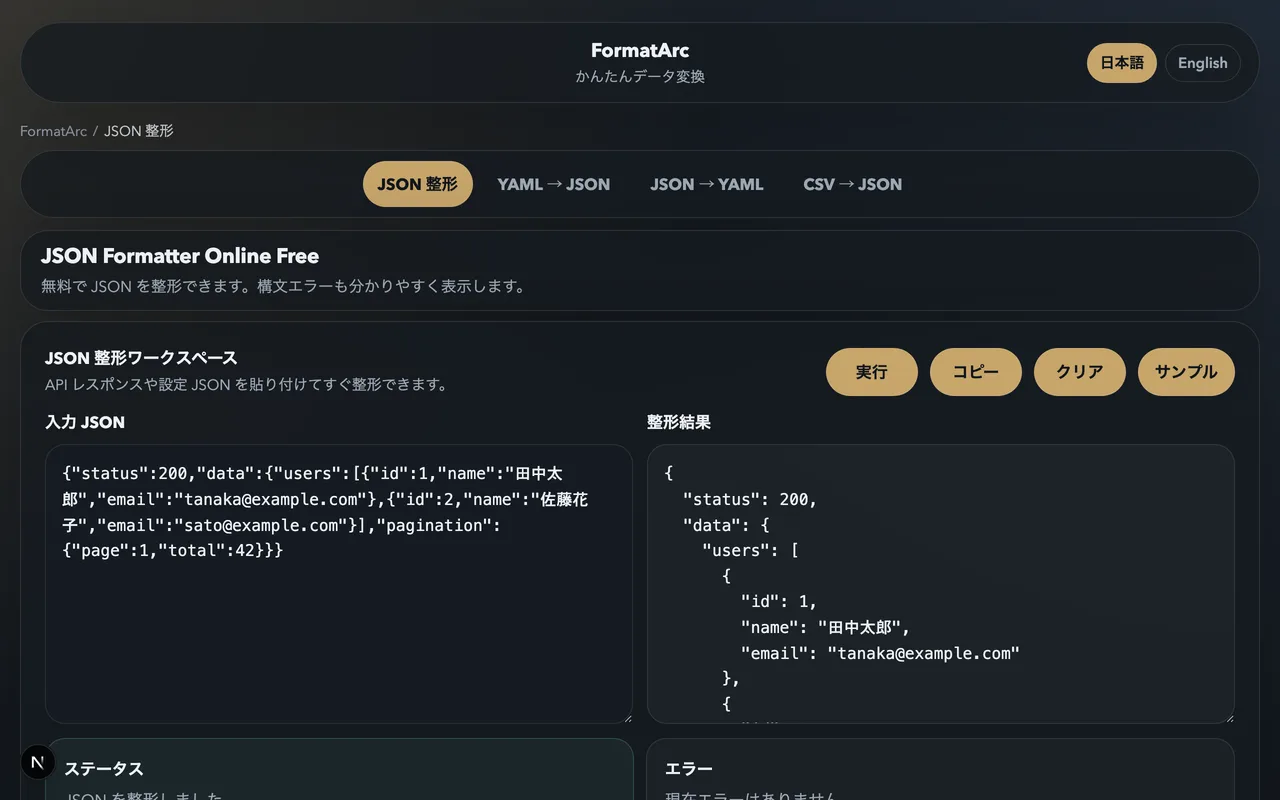 FormatArc は Chrome 拡張とは別のアプローチで、ブラウザ内で JSON 整形・YAML 変換・CSV 変換をまとめて処理できるツールサイトです。